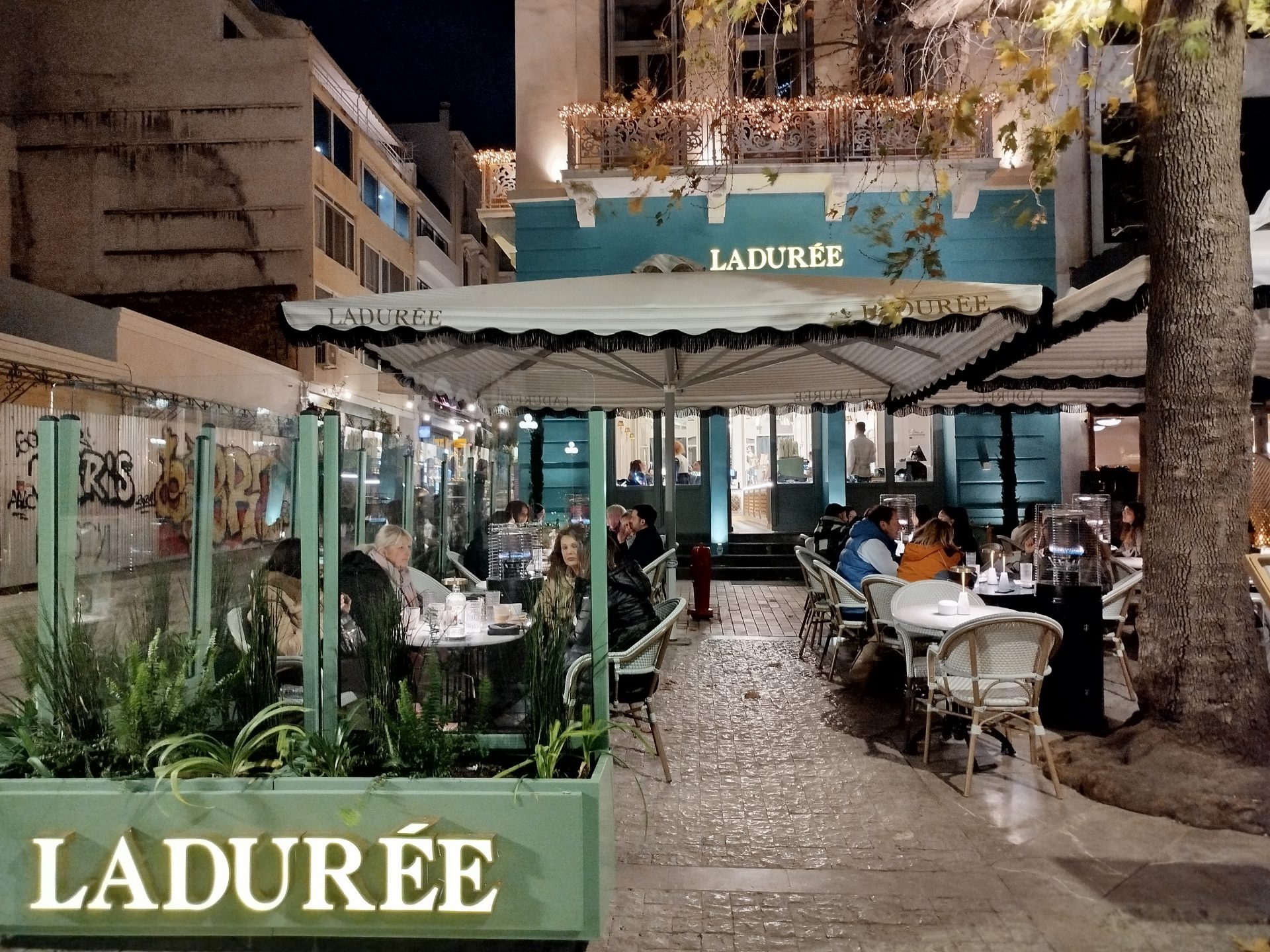 Επιστρέφουμε, όμως, στην Αθήνα και στο νέο κατάστημα της Μητροπόλεως. Είναι αργά το απόγευμα, ο καιρός κρύος και το Ladurée λάμπει διακριτικά πίσω από τα δέντρα της περιοχής. Ο φωτισμός του εσωτερικού διακρίνεται μέσα από τις μεγάλες τζαμαρίες και σε προσκαλεί να ανέβεις τα σκαλιά.