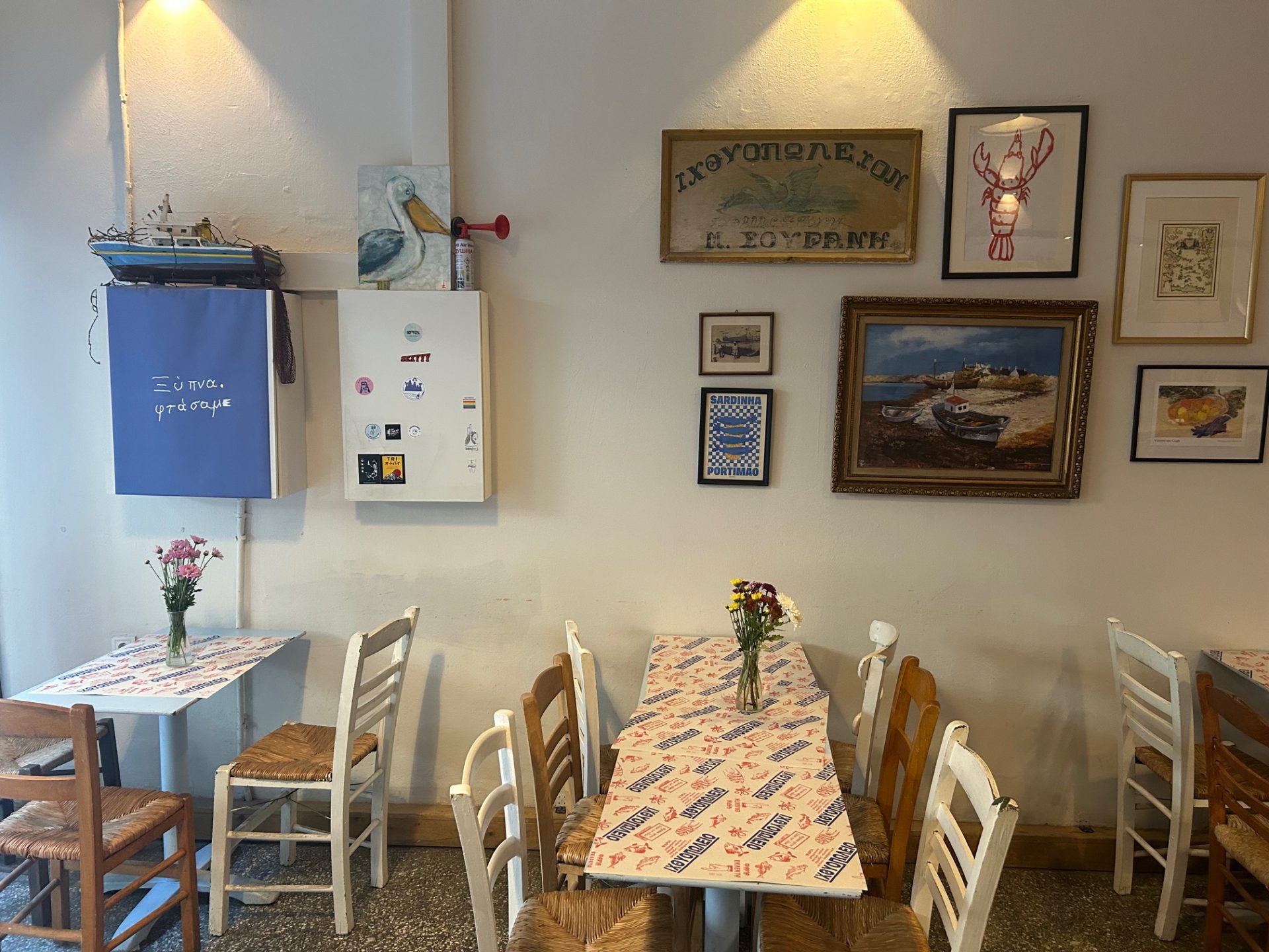 Τα τραπέζια είναι βαμμένα στο χρώμα της θάλασσας και οι ξύλινες καρέκλες με την ψάθα, λευκές οι περισσότερες. Στα βαζάκια, φρέσκα λουλούδια (από τον πλανόδιο πωλητή που περνά καθημερινά) και μπαίνοντας στο μαγαζί, πατώντας πάνω στο παλιό μωσαϊκό, θα δεις ότι τους τοίχους κοσμούν μικρά καδράκια με θαλασσινές εικόνες. Αντί για τραπεζομάντηλα, στρώνουν τα τραπέζια με κόλλες από αυτές που πακετάρουν τα ψάρια στα ιχθυοπωλεία.