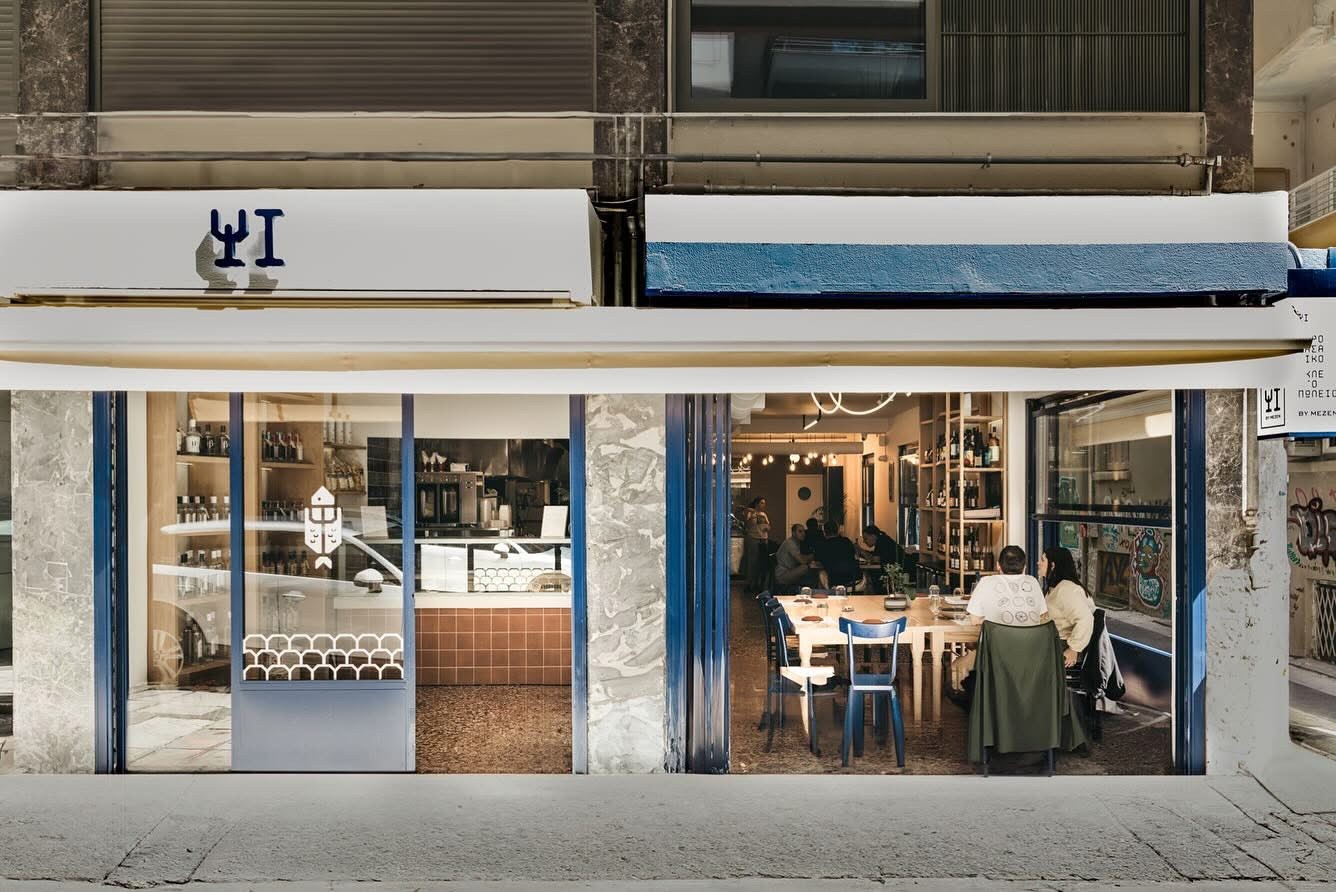 Το Ψι By Μεζέν έχει δύο διαφορετικά πρόσωπα: το σαλόνι με τα λιγοστά καθίσματα και τραπέζια, μαζί με το μπαρ -όπου μπορεί να σερβιριστεί κάποιος πελάτης- με το καλοσυντηρημένο μωσαϊκό και τα ξύλινα ράφια στα οποία αναπαύονται φιάλες κρασί και τοπικά προϊόντα από την Κω, την ιδιαίτερη πατρίδα του Ανδρέα Διακοδημήτρη.