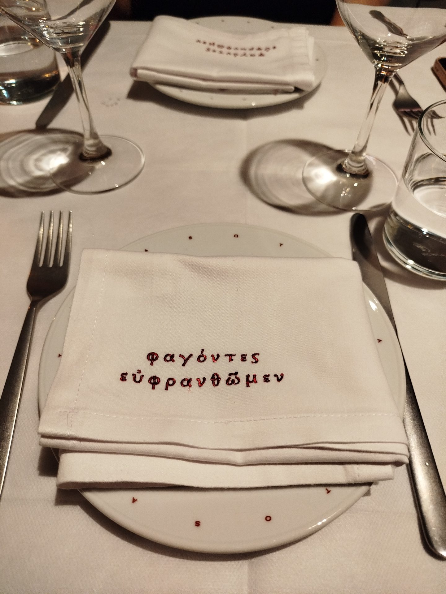 Το τραπέζι μου, δίπλα στο παράθυρο, μου χάριζε θέα τόσο στο εσωτερικό όσο και στο πεζοδρόμιο της γειτονιάς. Το σέρβις λειτουργεί άψογα: γρήγορο, χαμογελαστό και συντονισμένο, με αυστηρά δίωρα slots που εξασφαλίζουν ότι όλα κυλούν σαν ρολόι, ικανοποιώντας πλήρως το διεθνές κοινό που συχνάζει εδώ και κάνοντας τους ντόπιους να δυσανασχετούν λίγο. Δεν έχουμε ακόμη εκπαιδευτεί στον ξενόφερτο αυτό τρόπο του table seating.
