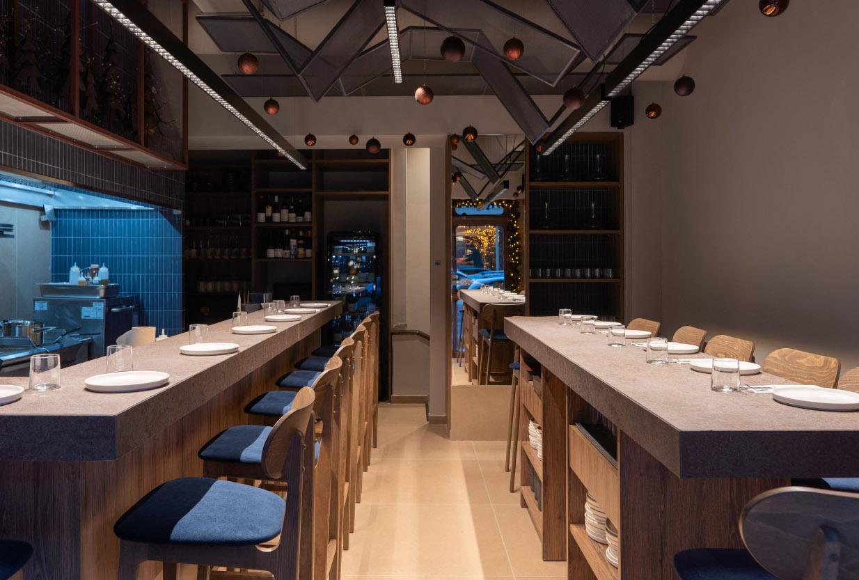 Δύο μπάρες με περίπου είκοσι θέσεις, όπου κάποιοι από τους επισκέπτες κάθονται μπροστά στην κουζίνα και παρακολουθούν τη δημιουργία των πιάτων να ξετυλίγεται μπροστά στα μάτια τους. Αυτή η διάδραση θέτει τον chef και τους μάγειρες στο κέντρο της εμπειρίας, εκμηδενίζοντας την απόσταση ανάμεσα στην κουζίνα και την τραπεζαρία, μια προσέγγιση που θυμίζει περισσότερο performance ή γαστρονομικό εργαστήριο παρά παραδοσιακό εστιατόριο.